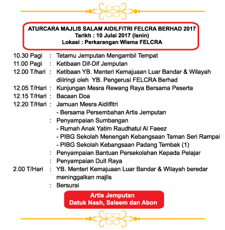 Dengan hormatnya dimaklumkan bahawa FELCRA Berhad akan menganjurkan Majlis Salam Aidilfitri FELCRA Berhad 2017 pada ketetapan seperti berikut: