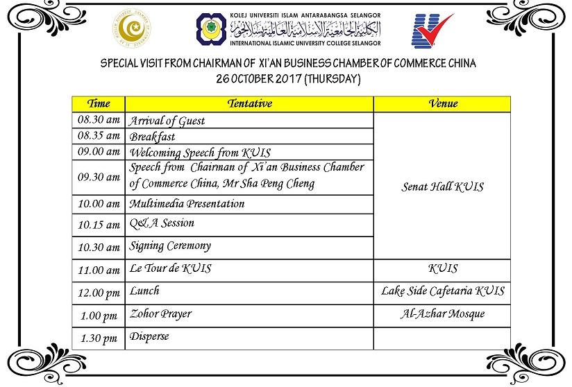 Semua rakan media adalah dijemput untuk membuat liputan Majlis Menandatangani Memorandum Persefahaman (MoU) KUIS & Xi'an Muslim Business Chamber Of Commerce China seperti ketetapan berikut: