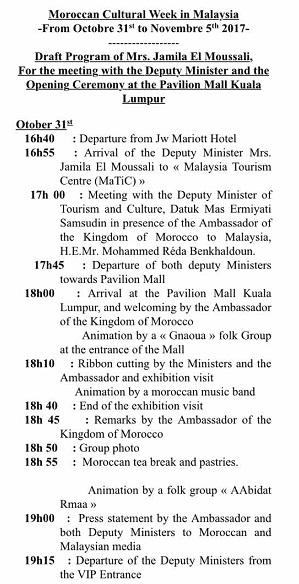Kementerian Pelancongan dan Kebudayaan Malaysia akan menganjurkan Majlis Pembukaan 'Morocco Cultural Week' seperti ketetapan berikut: