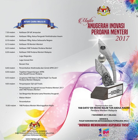 Unit Pemodenan Tadbiran dan Perancangan Pengurusan Malaysia (MAMPU), Jabatan Perdana Menteri akan menganjurkan Majlis Anugerah Inovasi Perdana Menteri (AIPM) 2017 dengan bertemakan 'Inovasi Menunjangi Aspirasi TN50' pada ketetapan seperti yang berikut: