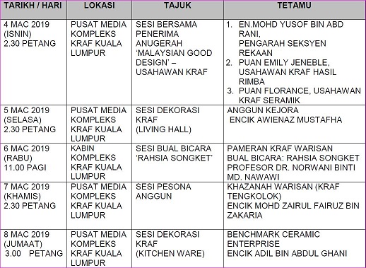 Dimaklumkan, bersempena dengan sambutan Hari Kraf Kebangsaan 2019, Kraftangan Malaysia sukacita menjemput pihak media membuat liputan seperti jadual berikut: