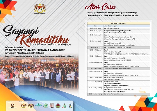 Sukacita dimaklumkan bahawa Program Sayangi Komoditiku anjuran Institut Perladangan dan Komoditi (IMPAC) dengan kerjasama agensi di bawah Kementerian Industri Utama akan menganjurkan Program Sayangi Komoditiku yang akan disempurnakan oleh YB Datuk Seri Shamsul Iskandar Mohd Akin, Timbalan Menteri Industri Utama seperti ketetapan berikut: