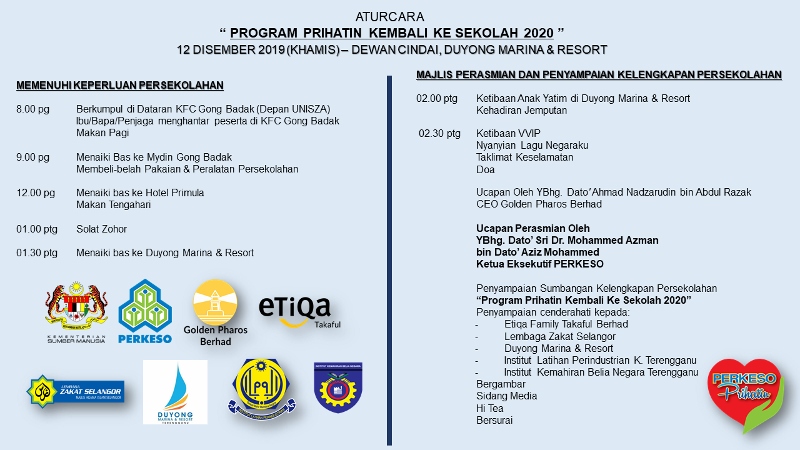 Dimaklumkan bahawa PERKESO akan mengadakan Majlis Perasmian dan Penyampaian Kelengkapan Persekolahan "Program Prihatin Kembali ke Sekolah 2020" bagi meraikan anak-anak yatim penerima faedah PERKESO dalam memenuhi keperluan persekolahan mereka menjelang tahun 2020 seperti ketetapan berikut: