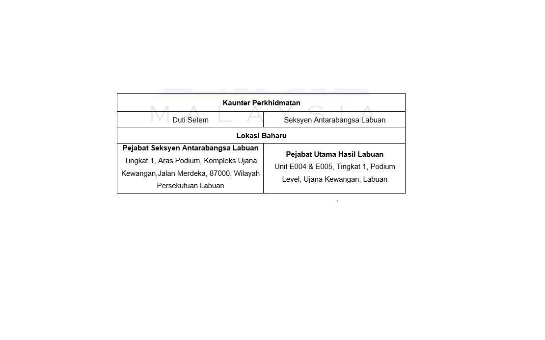 back office pejabat HASiL lokaliti Labuan juga akan diarahkan untuk bekerja dari rumah sepenuhnya sehingga kerja-kerja pengubahsuaian, pembaikan dan penyelenggaraan ini selesai. Sekiranya pembayar cukai ingin berhubung dengan para pegawai bagi sebarang urusan percukaian, panggilan masih boleh dibuat melalui talian operator di talian 087-595300.