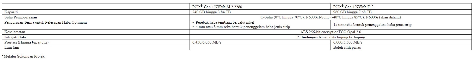 SSD M.2 2280 tersedia dalam kapasiti daripada 240 GB hingga 3.84 TB, manakala SSD U.2 tersedia daripada 960 GB hingga 7.68 TB untuk pilihan yang lebih berkesan kos untuk keperluan storan yang pelbagai.
