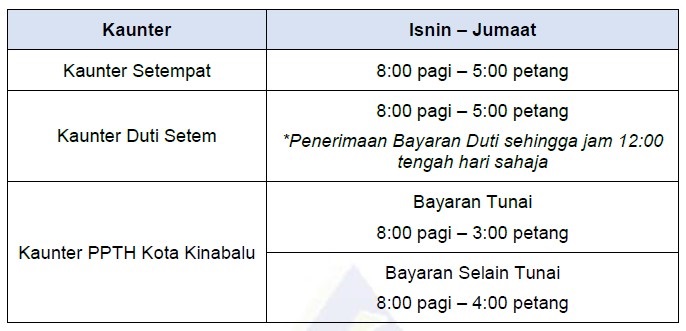 Waktu operasi kaunter-kaunter perkhidmatan HASiL tersebut adalah seperti yang berikut: