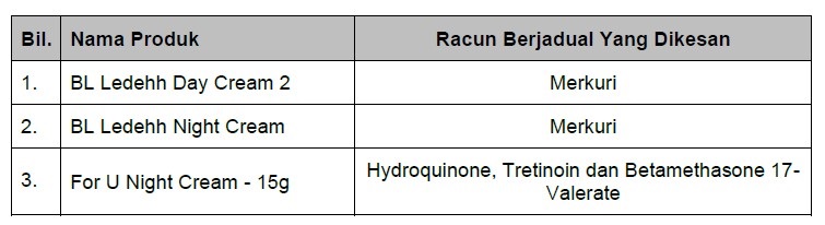 KUALA LUMPUR, 21 Ogos (Bernama) -- Bahagian Regulatori Farmasi Negara (NPRA), Kementerian Kesihatan Malaysia (KKM) ingin menggesa orang awam untuk mengelak daripada membeli dan menggunakan produk-produk kosmetik berikut kerana dikesan mengandungi racun berjadual seperti di bawah: