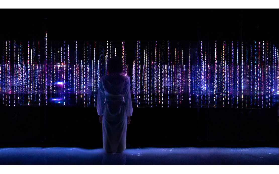 PEMASANGAN YANG BAHARU DIPERKENALKAN: CAHAYA PEPEJAL EFEMERAL (EPHEMERAL SOLIDIFIED LIGHT)Dalam karya seni imersif yang dialami pengunjung dengan memasuki air, banyak cahaya terapung di udara, setiap cahaya terdiri daripada pelbagai warna. Sempadan setiap warna dipisahkan dengan jelas seolah-olah dalam bentuk pepejal. Pemisahan warna yang nampak seperti dalam bentuk pepejal bagi banyak cahaya tidak dapat dilihat di dunia semula jadi dan disebabkan oleh penyegerakan yang melampau. Melalui swaorganisasi dari masa ke masa, fenomena penyegerakan ini mewujudkan struktur tertib yang besar.