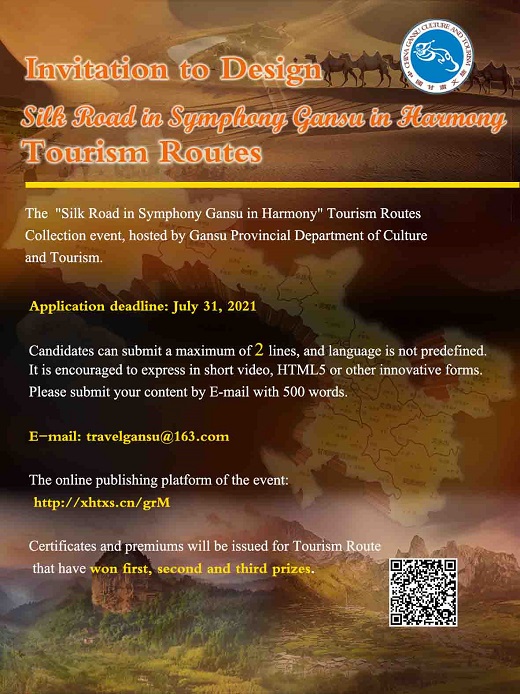 "Silk Road in Symphony Gansu in Harmony" Tourism Routes Collection organized by Gansu Provincial Department of Culture and Tourism will be held from July 3 to July 31, 2021. Please submit the work by email with a design description of 500 words to travelgansu@163.com.