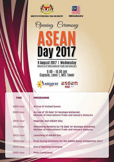 Ministry of International Trade and Industry (MITI) would like to invite all local and international media to attend our upcoming programme “OPENING CEREMONY OF ASEAN DAY 2017”.