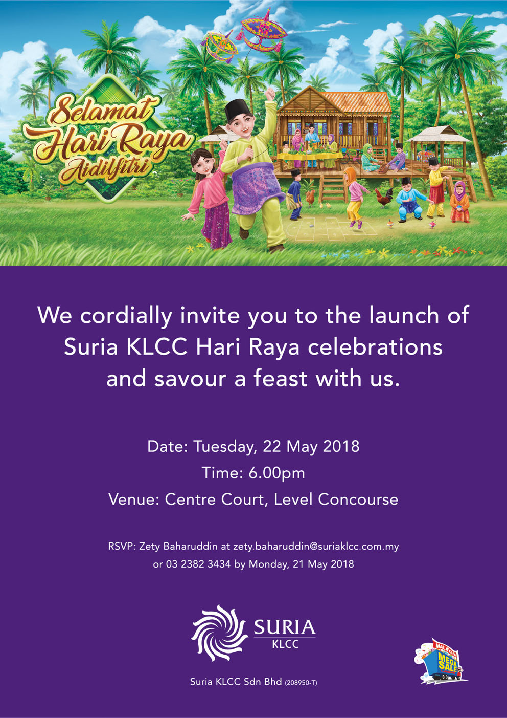 Kindly RSVP your attendance with Zety Baharuddin at 03 – 2382 3320 or email zety.baharuddin@suriaklcc.com.my by 12.00 pm on Monday, 21 May 2018.