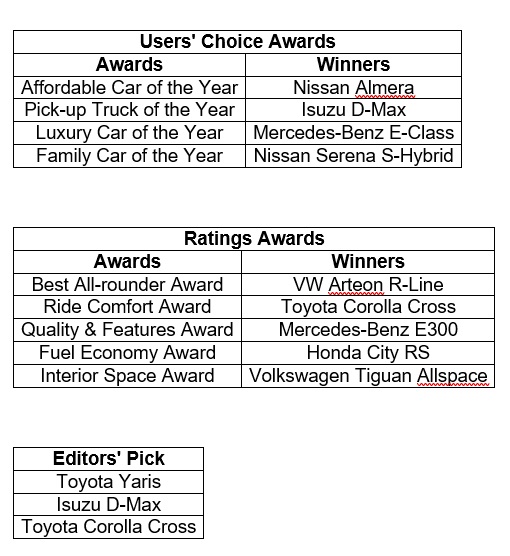 A total of 12 awards categories were created, all based on Malaysian car buying - 4 Users' Choice Awards, 5 Ratings Awards, and 3 Editors' Picks.
