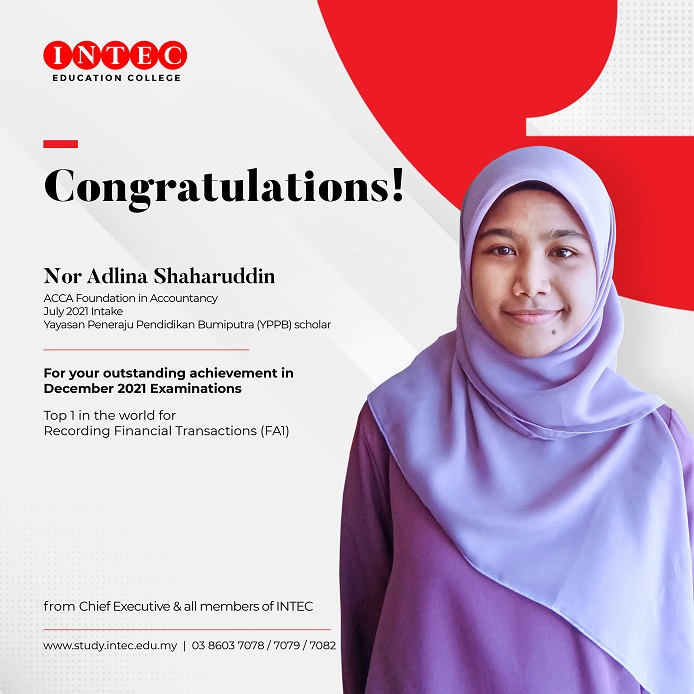 SHAH ALAM, Jan 24 (Bernama) -- INTEC student, Nur Adlina Shaharuddin, was announced as the World number one (1) in Recording Financial Transactions (FA1) for her December 2021 examination of ACCA Foundation in Accountancy (FIA). Adlina who is originally from Sungai Petani, Kedah, said that she is now staying in Kedah while doing her study only through online platform.