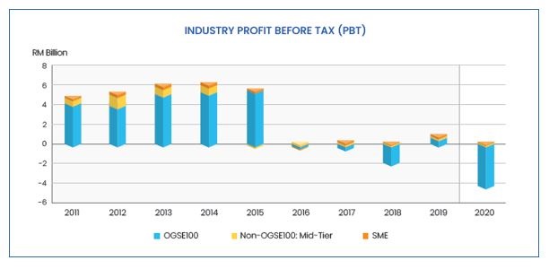 For FY2020, the OGSE sector recorded RM56.2 billion in the year under review, down 13.7 per cent from RM65.1 billion in 2019 and incurred a loss of RM4.01 billion on asset impairments by several asset-heavy OGSE players including Sapura Energy, Velesto Energy Bhd, Bumi Armada Bhd and MISC. (see chart below)