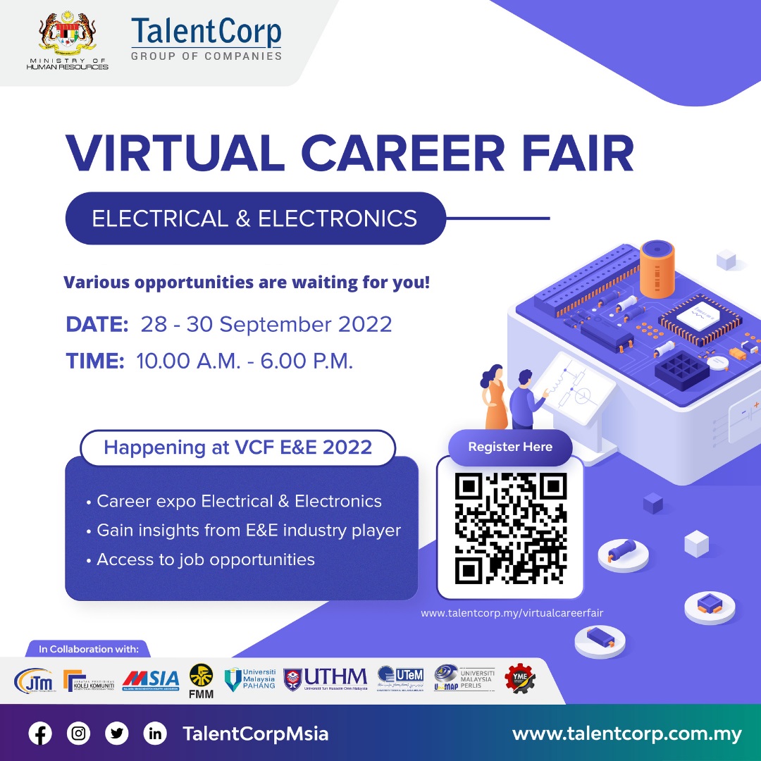 KUALA LUMPUR, Sept 19 (Bernama) -- Talent Corporation Malaysia Berhad (TalentCorp) will be organising its first-ever virtual career fair focusing on the Electrical & Electronics (E&E) sector from 28 September to 30 September 2022, 10.00am to 6.00pm.