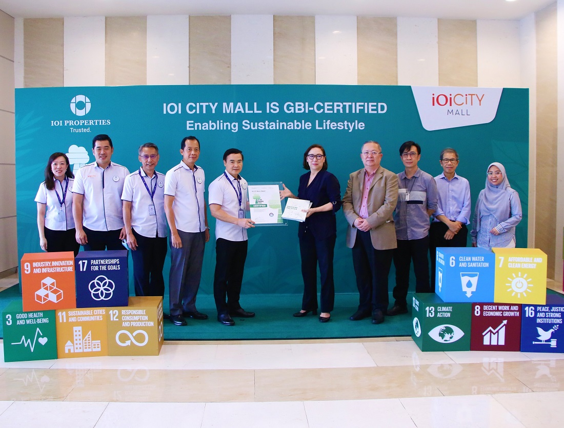 Ar. Serina Hijjas, Chairman of the Green Building Index Accreditation Panel (GBIAP) presenting the GBI certificate to Dato’ Voon Tin Yow, CEO of IOIPG at IOI City Tower 2. Also present are IOIPG senior management, representatives from GBIAP and BGreen Associates Sdn Bhd.PUTRAJAYA, Oct 25 (Bernama) -- IOI Properties Group (IOIPG) is pleased to announce that IOI City Mall has received the Green Building Index (GBI) certification under Non-Residential Existing Building (NREB).