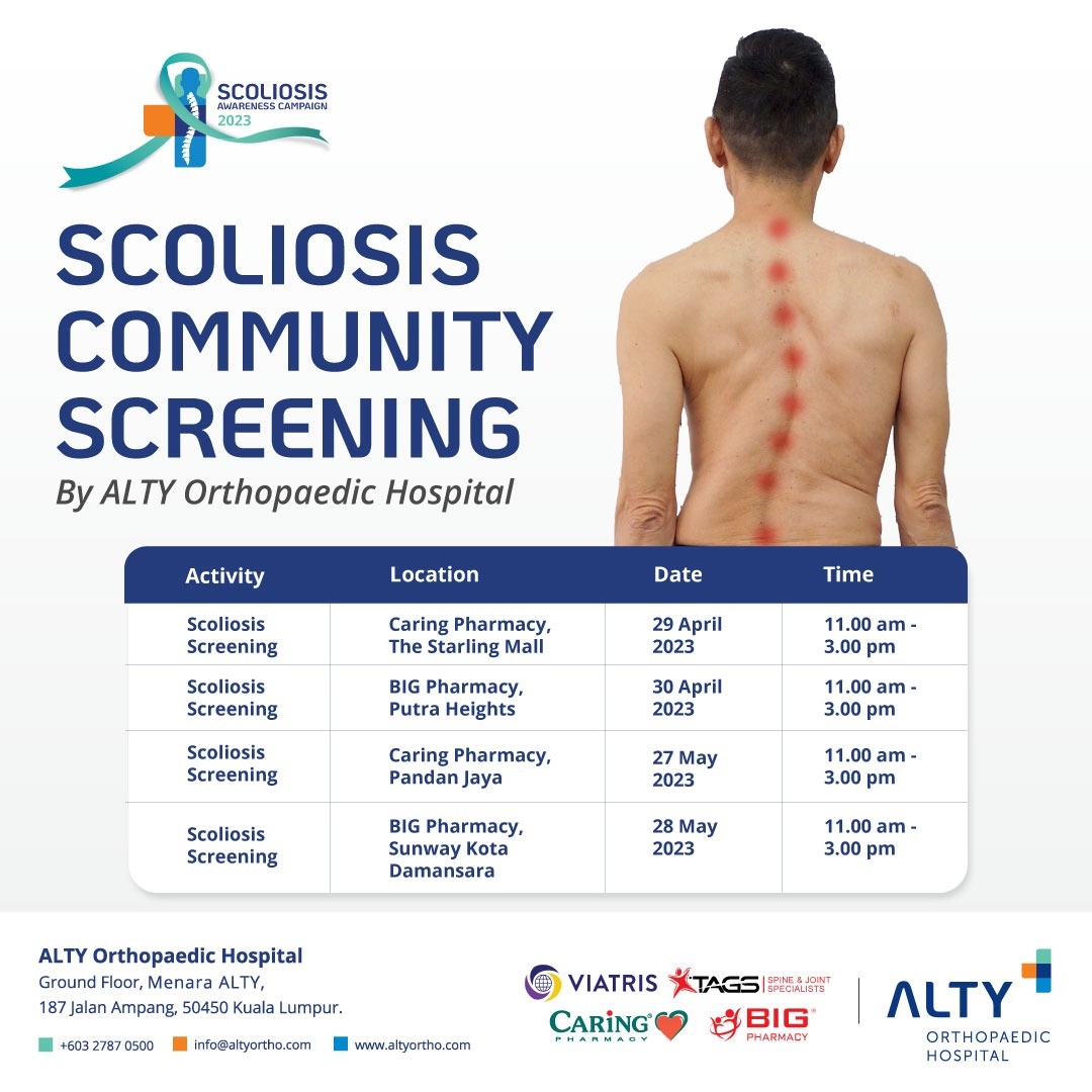 The public screening will be taking place across Caring and BIG Pharmacy outlets across 4 different locations. KUALA LUMPUR, May 2 (Bernama) -- ALTY Orthopaedic Hospital (ALTY), one of Malaysia’s first single-specialty orthopaedic hospitals, returns for the second year with its Scoliosis Awareness Campaign, in efforts to raise awareness among Malaysian communities on Scoliosis through pharmacies and schools.