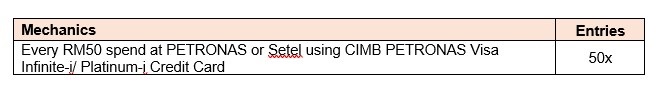 All CIMB PETRONAS Visa Islamic principal and supplementary cardholders are eligible to participate in the ‘Drive4Rebat Hebat’ Contest, which will run from 1 June - 31 August 2023* with entries being rewarded to cardholders who spend at PETRONAS using the card, based on the following: