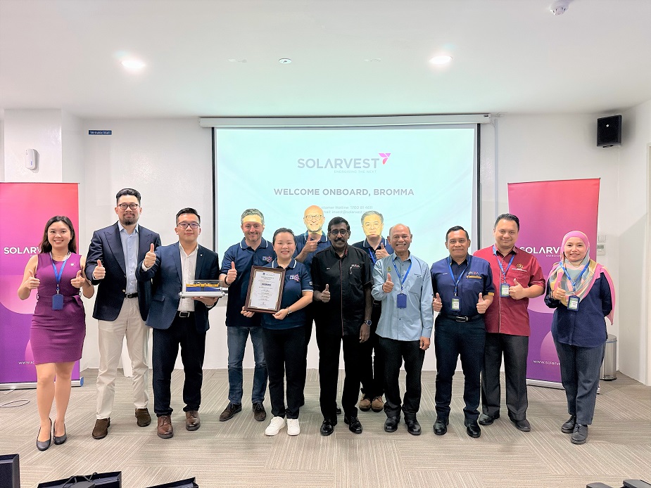 MWp rooftop solar PV installation project completion ceremony with representatives from Solarvest Holdings Berhad, Bromma (Malaysia) Sdn Bhd, and Malaysian Investment Development Authority (MIDA).