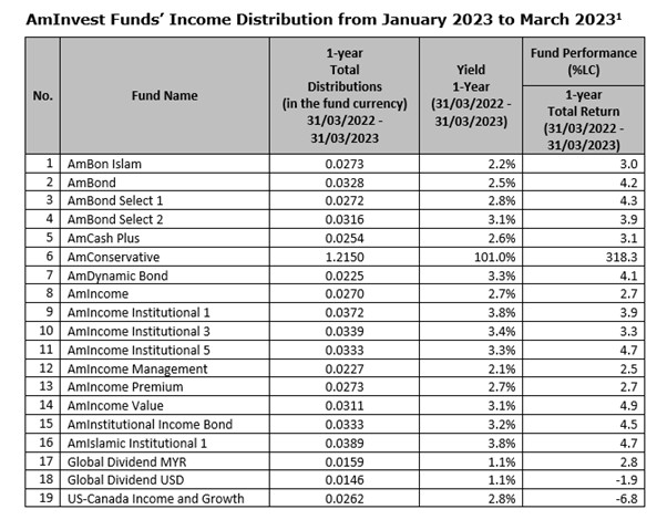 The income distribution declared for AmConservative (the “Fund”), one of the funds involved, translates to a high income distribution yield of 101% due to the release and distribution of monies in December 2022 and January 2023 in relation to the Fund’s investments in bonds issued by Aldwich Berhad which was reflected in the Fund’s Net Asset Value (“NAV”) during the same period. AmIncome Institutional 1 and AmIslamic Institutional 1, meanwhile, each recorded an income distribution yield of 3.8%.