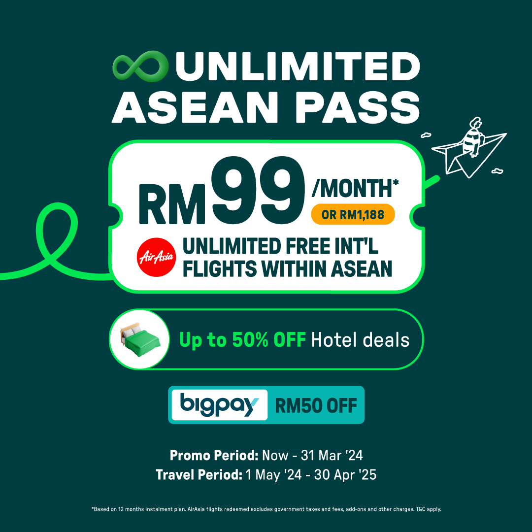 Unlimited - Asean International Pass at RM99* per month for 12 months. BigPay users are also eligible for a loan financing of RM106 per month for 12 months, exclusively on the BigPay app.