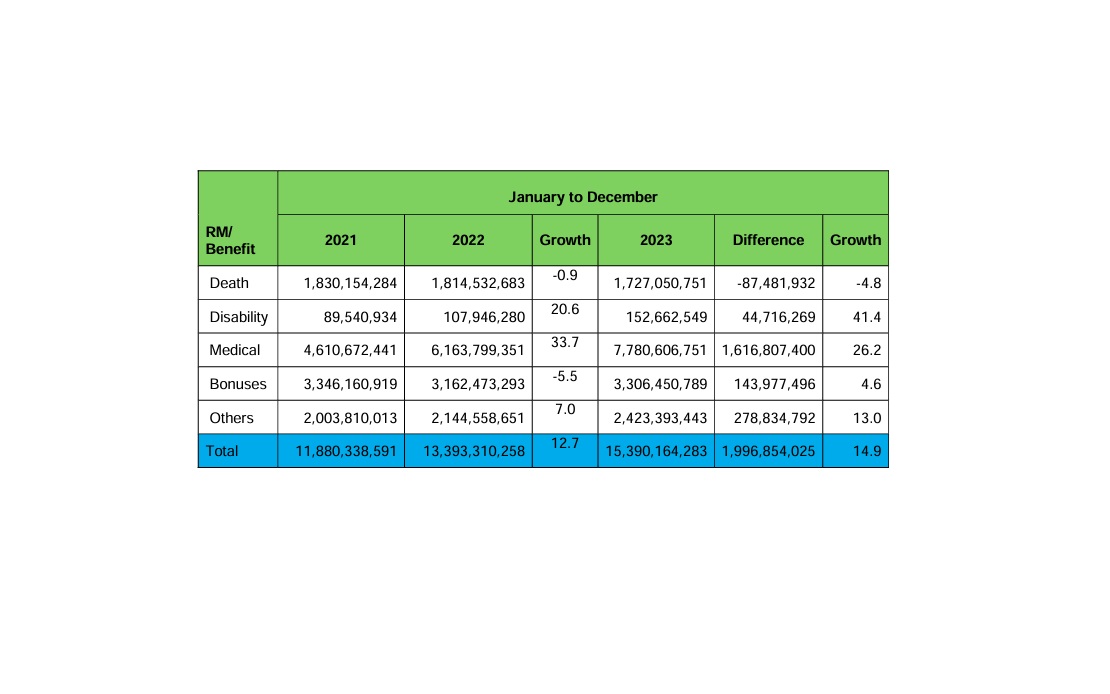 CLAIMS PAYOUT The total claims payout in 2023 surged by 14.9% to RM15.4 billion in 2023 compared to RM13.4 billion in 2022. The increase was primarily driven by the hike of 41.4% in disability payment and 26.2% in medical claims.
