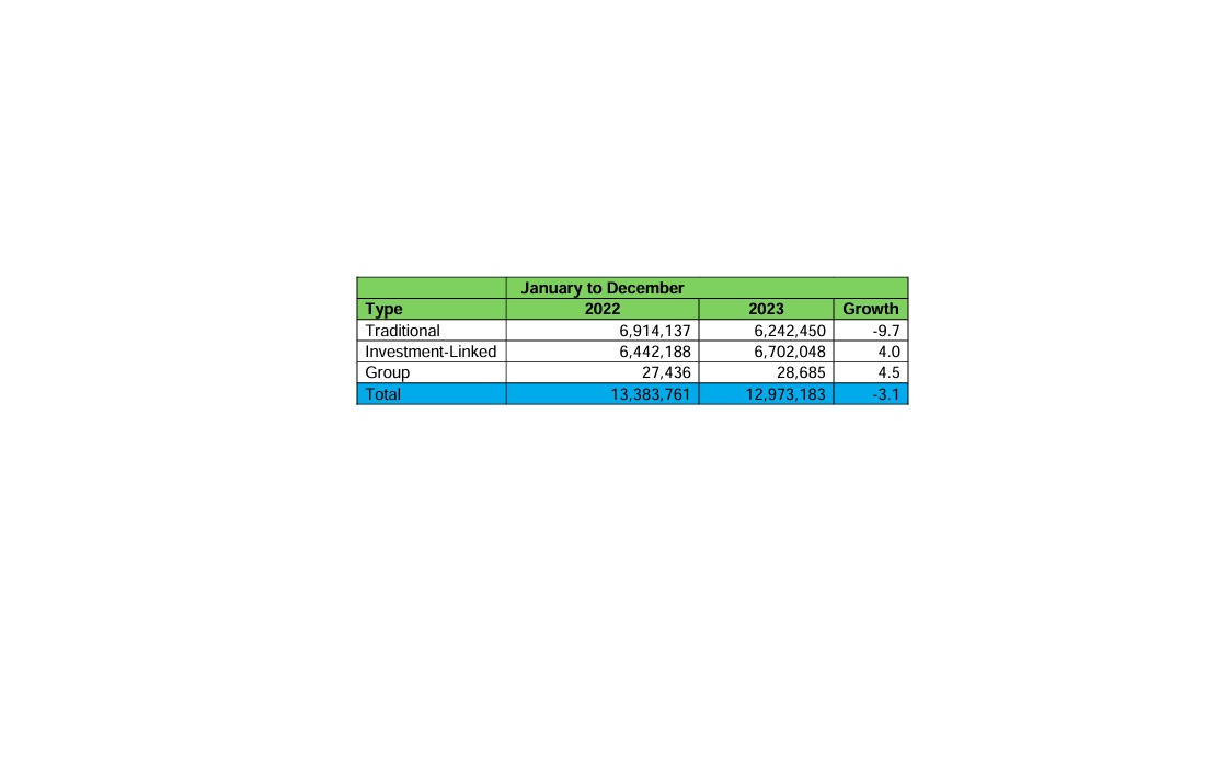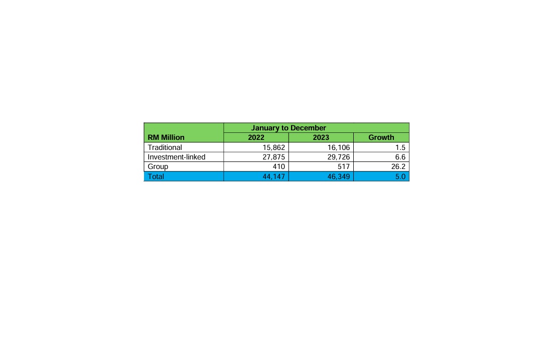Meanwhile, the number of new investment-linked policies grew by 6.8% to 709,378 and new group policies increased by 5.8% to 21,975 in 2023. However, new traditional policies recorded a decline of 56.9% from 1.2 million in 2022 to 496,115 in 2023, resulting in the overall number of policies falling 33.2% to 1.2 million in 2023 compared to 1.8 million in 2022. The drop in the new traditional policies was compounded by the absence of policies issued in 2023 under the Perlindungan Tenang Voucher Scheme which ended in November 2022. Some 437,024 policies were issued in 2022 under the Perlindungan Tenang Voucher Scheme.