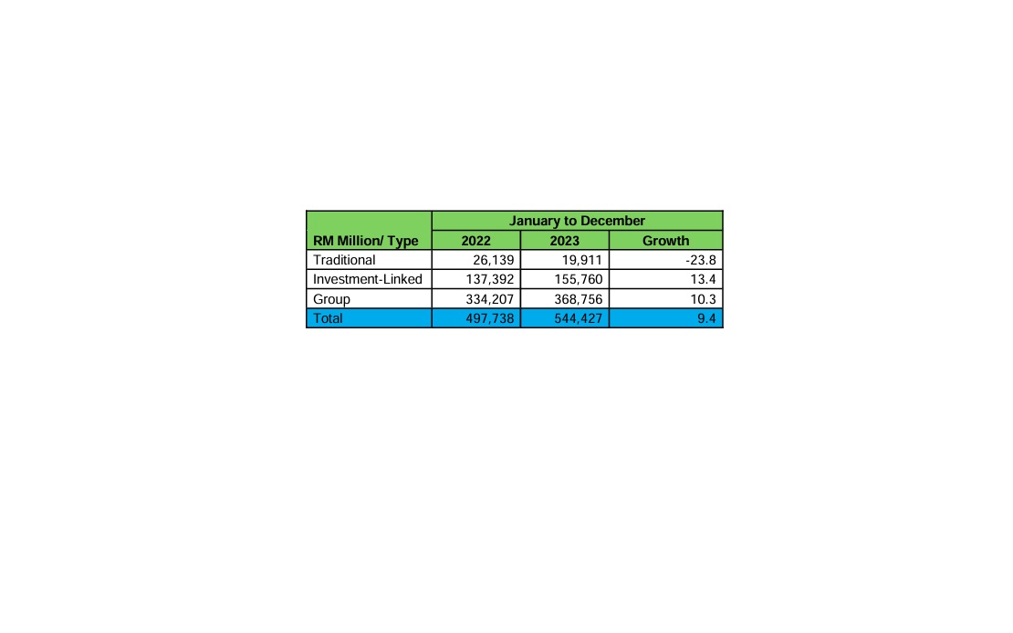The overall new business sum assured recorded 9.4% growth to RM544.4 billion in 2023 as compared to RM497.7 billion in the previous year. The new business sum assured of investment-linked policies and group policies recorded a double-digit growth of 13.4% to RM155.8 billion and 10.3% to RM368.8 billion, respectively, in 2023.