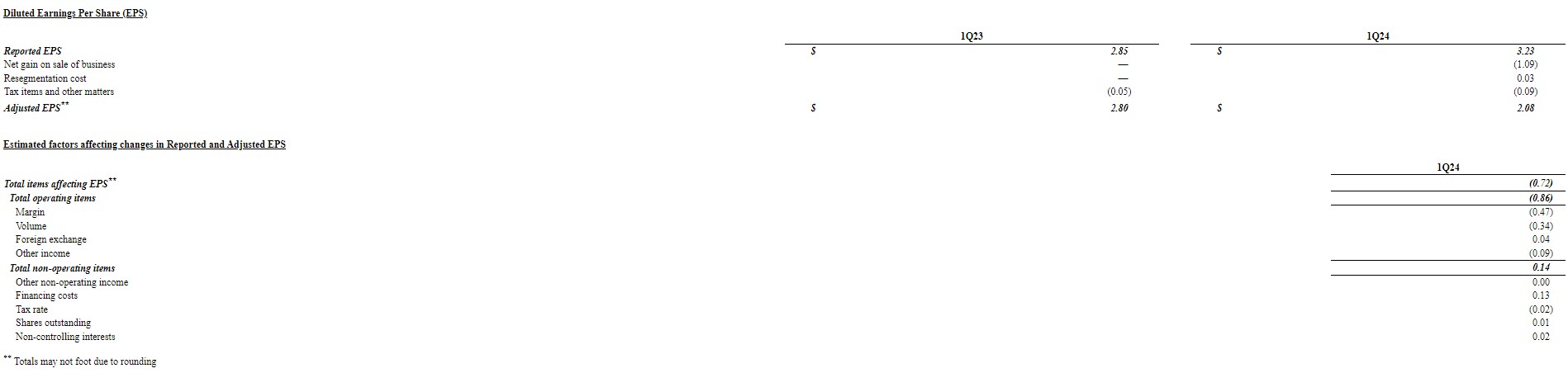 The Company now expects its full-year 2024 reported EPS to be in the range of $10.35 to $11.00, which includes the impact of the gain on the divestiture of the South Korea business completed on February 1, 2024, and adjusted EPS to be in the range of $9.20 to $9.85.