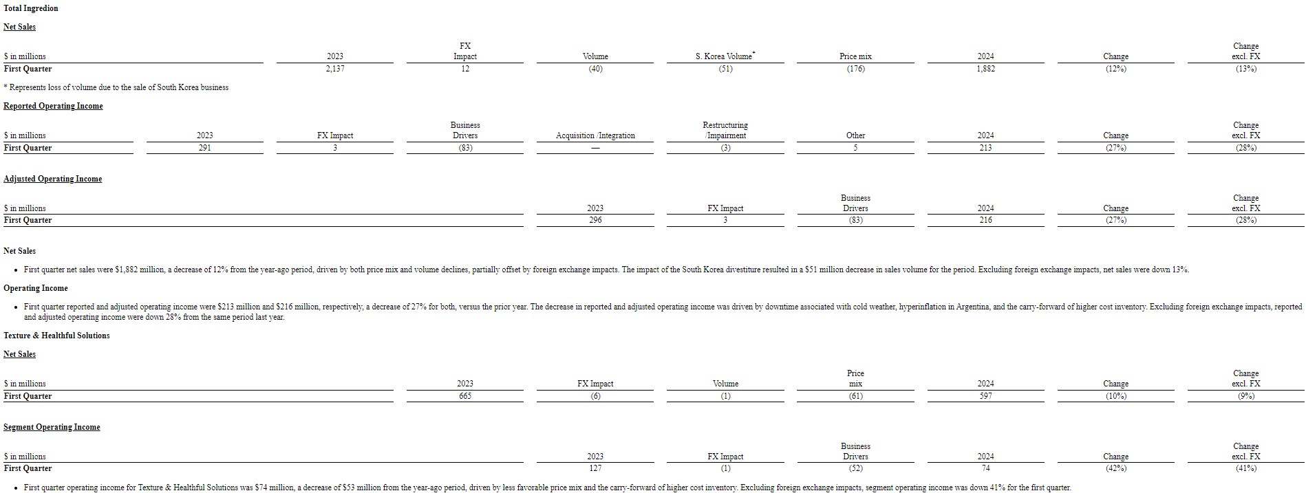 WESTCHESTER, Ill., May 9 (Bernama-GLOBE NEWSWIRE) -- Ingredion Incorporated (NYSE: INGR), a leading global provider of ingredient solutions to the food and beverage manufacturing industry, today reported results for the first quarter of 2024. The results, reported in accordance with U.S. generally accepted accounting principles (“GAAP”) for the first quarter of 2024 and 2023, include items that are excluded from the non-GAAP financial measures that the Company presents.