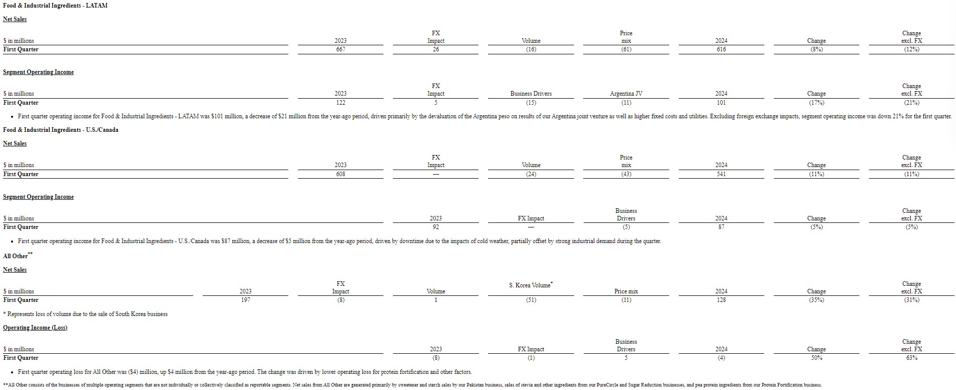 Excluding the effects of the divestiture of the South Korea business, the Company expects full-year 2024 net sales to be flat to up low single-digits, reflecting the pass-through of lower corn values. Reported and adjusted operating income is expected to be up mid-single-digits.