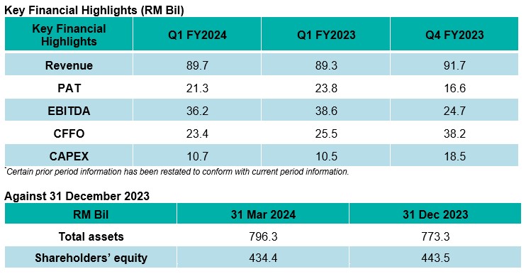 KUALA LUMPUR, May 31 (Bernama) -- For the first quarter ended 31 March 2024, PETRONAS recorded revenue of RM89.7 billion, comparable to the first quarter of 2023 amid prolonged volatility in the pricing landscape.