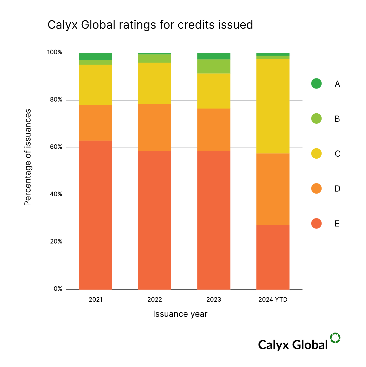 · The issuance of lowest-grade credits has dropped nearly 50% as a proportion of total issued credits to date in 2024. · Quality updates related to improving the rules and requirements for credit generation have not yet made their way onto the active market. · While benefits “beyond carbon” are attractive to buyers, it is a search for higher GHG integrity that is driving trends in the market today.