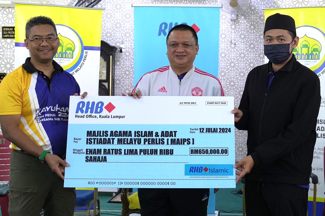 Dato’ Adissadikin Ali, Managing Director and CEO of RHB Islamic Bank Berhad [far left], presented a zakat contribution of RM650,000 to Tuan Haji Mohd Nazim Mohd Noor, CEO of MAIPs [far right], in the presence of DYMM Tuanku Syed Faizuddin Putra ibni Tuanku Syed Sirajuddin Jamalullail, the Regent of Perlis (“DYMM Pemangku Raja Perlis”) [centre].Drive Economic Empowerment through Zakat Contribution of RM650,000 and Capacity-Building Programmes KUALA LUMPUR, July 15 (Bernama) -- RHB Islamic Bank Berhad (“RHB Islamic” or “Bank”) has once again partnered with Majlis Agama Islam dan Adat Istiadat Melayu Perlis (“MAIPs”) for the annual