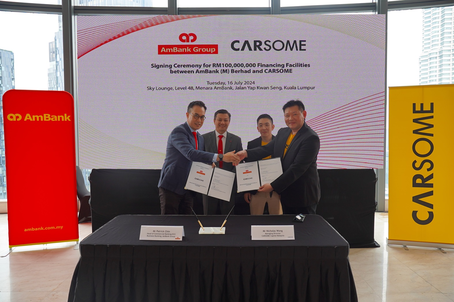 (L-R) Patrick Chin, Head of Commercial Banking, Business Banking, AmBank Group, Christopher Yap, Managing Director of Business Banking, AmBank Group, Eric Cheng, Co-Founder, Chairman and Group CEO of CARSOME and Nicholas Wong, Managing Director of CARSOME Capital Malaysia at the Signing Ceremony for RM100,000,000 Financing Facilities between AmBank (M) Berhad and CARSOMEKUALA LUMPUR, July 16 (Bernama) -- CARSOME Group (“CARSOME”) has secured RM100 million in financing facility from AmBank Group to expand its liquidity and bolster its capacity for future growth. Established in 2015, CARSOME has made rapid strides in the business landscape and is now Southeast Asia’s largest integrated car e-commerce platform. CARSOME’s end-to-end ecosystem has significantly expanded through its comprehensive suite of services, including car inspections, sales, financing, and after-sales support. The RM100 million financing facility secured from AmBank Group will empower CARSOME, significantly enhancing its capacity to grow and innovate. This substantial funding will enable CARSOME to extend its reach, enhance its services, and drive sustained growth, reinforcing its commitment to delivering exceptional value across all facets of its operations. With AmBank’s support, CARSOME will be able to further accelerate different stages of the used car trading process, offering a comprehensive, hassle-free experience to its customers. AmBank's commitment to supporting CARSOME underscores the bank’s dedication to fostering the growth of forward-thinking businesses and driving the evolution of the automotive industry in the region. AmBank is pleased to support CARSOME’s remarkable growth and innovation in providing end-to-end solutions for customers. Their exemplary track record in the used car market makes us proud to partner with them in revolutionising Malaysia’s automotive ecosystem. With their strong brand equity, financial standing, and extensive customer base, we look forward to seeing how this collaboration can further fortify CARSOME Capital's operations and prospects. We hope to continue to expand opportunities with CARSOME in the coming years,” said Christopher Yap, Managing Director, Business Banking, AmBank Group Eric Cheng, CARSOME Group’s Co-Founder, Chairman, and Chief Executive Officer said, “We are thrilled to partner with AmBank, marking a pivotal moment in our journey to revolutionize the automotive industry. A financing facility at this scale is a strong validation of CARSOME’s business model and allows us to enhance CARSOME Group’s overall financing capabilities. It also underscores our commitment to providing accessible solutions for our customers and elevating the car ownership experience. Through CARSOME Capital, we will leverage this partnership to further expand our service offerings, broadening our impact and continuing to innovate in the automotive ecosystem across Southeast Asia. About AmBank GroupAmBank Group is a leading financial services group with over 40 years of expertise in supporting the economic development of Malaysia. We have over three million customers and employ over 8,000 people. The Group was listed on the Main Market of Bursa Malaysia in 1988. It is the sixth-largest banking group by assets in Malaysia, with a market capitalisation of more than RM13 billion as at 31 March 2024. AmBank Group serves over three million individual and corporate customers. It provides services in wholesale banking, retail banking, business banking, investment banking and related financial services which include Islamic banking, underwriting of general insurance, life insurance, family takaful, stock and share broking, futures broking, investment advisory and asset management services in unit trusts and real estate investment trusts. For more information, please visit www.ambankgroup.com About CARSOME CARSOME is Southeast Asia’s largest integrated car e-commerce platform. With operations across Malaysia, Indonesia, Thailand, Singapore, and the Philippines, CARSOME aims to digitize the region’s used car industry by reshaping and elevating the car transaction and ownership experience. Together with subsidiary brands iCar Asia, WapCar, and CarTimes, CARSOME provides end-to-end solutions to consumers and used car dealers across the decision funnel, from car content consumption, car inspection, and ownership transfer to financing and other ancillary services, promising to bring trust, transparency, and choice to our customers. For more information, please visit www.carsome.com. Source: AmBank Group