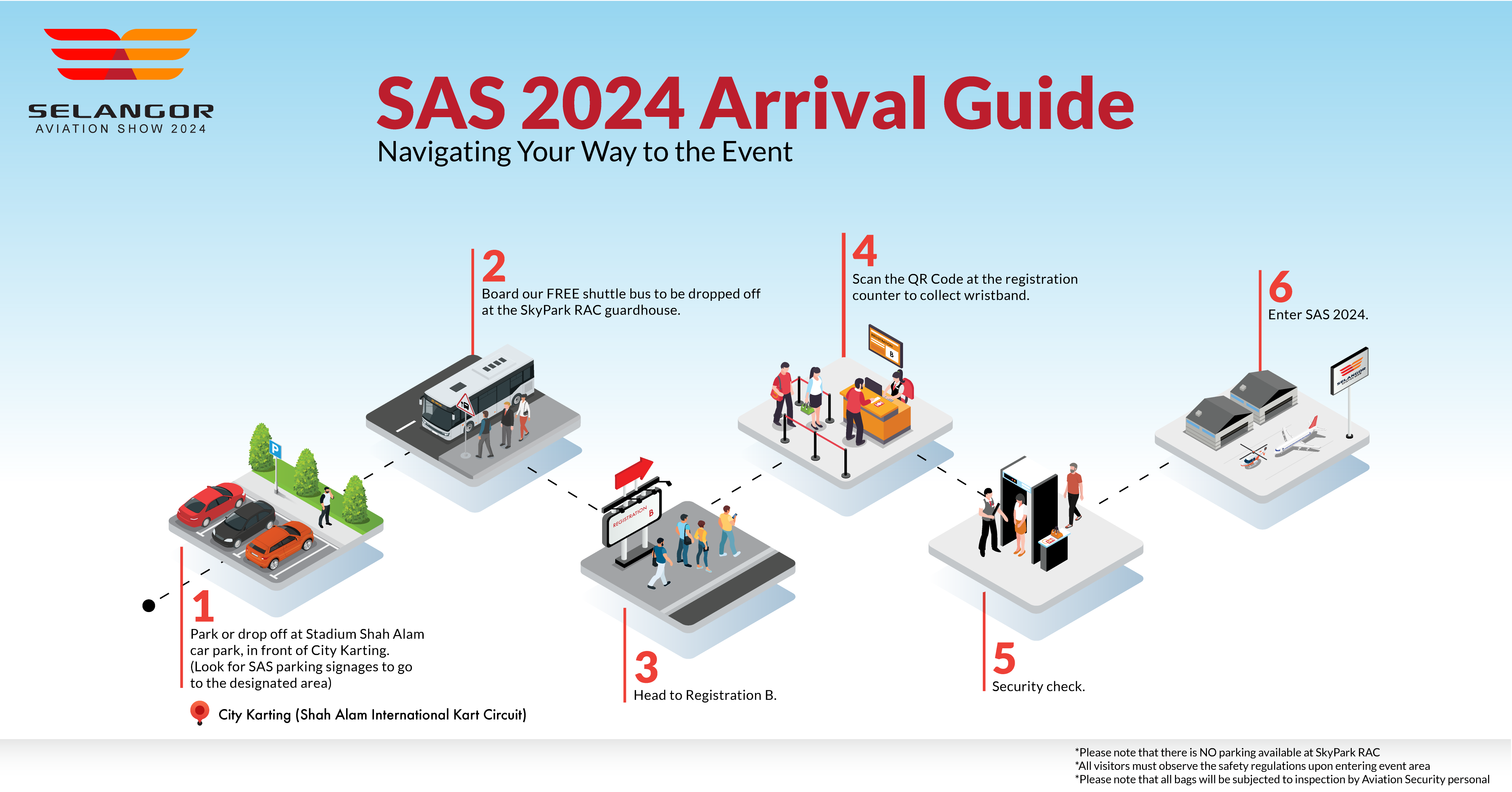 SAS 2024 Arrival GuideSHAH ALAM, Sept 9 (Bernama) -- The highly anticipated fourth edition of the Selangor Aviation Show (SAS 2024) is scheduled to take flight from 12 to 14 September 2024 at the SkyPark Regional Aviation Centre (RAC), Selangor. Operating daily from 10.00am to 6.00pm, the event has already garnered impressive interest with approximately 32,874 visitors.