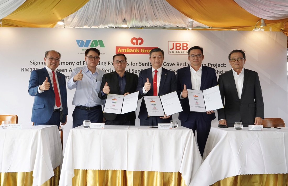 .jpg) (From left) Jamie Ling, Group Chief Executive Officer of AmBank Group, Quay Chew Keong, Chief Executive Officer of WM Senibong, Ling Ngie Soon, Project Director of WM Senibong, Christopher Yap, Managing Director of Business Banking, AmBank Group, Brian Lam Fung Eng, Executive Director of JBB Builders International Limited and Dato’ James Ng Say Piyu, Co-Founder, Chairman of the Board and Executive Director of JBB Builders International Limited at the signing ceremony.JOHOR BAHRU, Sept 30 (Bernama) -- AmBank Group has granted RM115 million financing facilities to Senibong Cove Development Sdn Bhd, a wholly owned subsidiary of WM Senibong Sdn Bhd; and RM78 million to JBB Builders (M) Sdn Bhd, the appointed contractor for the reclamation of 150 acres of waterfront land in Senibong Cove, directly across the Johor Strait from Sembawang, Singapore (“The Project”). Senibong Cove is a luxury waterfront development in Johor Bahru; well-known for its beautiful marina, lush vistas, and spectacular water views. This is an exclusive 215-acres community, situated across the Johor Straits from Singapore, redefining waterfront lifestyle. Today, Senibong Cove boasts an extensive waterfront boardwalk, a world-class marina, lush parks and more than 1,400 completed homes. The Project is an extension of the Senibong Cove masterplan and expansion of landbank to provide more high-quality designed homes in curated communities. The Project which is expected to be completed in 2028 with an estimated GDV of more than RM5 billion, will allow for the development of more than 4,000 high end terraces, apartments, hotels and serviced apartments, retail, and customs and immigration clearance facility for private leisure craft and yachts. “Leveraging on the momentum of the recently announced Johor-Singapore Special Economic Zone (JS-SEZ), we are glad to have part-financed this milestone for Senibong Cove. It is important for organizations to embark on sustainable projects to improve the socio-economic status of the nation. We are aware of our responsibility as corporate citizens to contribute towards holistic growth and sustainable development of the community. AmBank recognises the need for accessible financing options to empower businesses in their efforts towards sustainable development. This sprawling development is not only an investment in real estate but an investment in a more sustainable and inclusive future,” said Jamie Ling, Group Chief Executive Officer, AmBank Group Christopher Yap, Managing Director, Business Banking, AmBank Group said, “As part of the bank’s support towards Senibong Cove Development Sdn Bhd and JBB Builders (M) Sdn Bhd, we are pleased to play our part towards the ongoing development of Johor and to deliver socially responsible projects that benefit the broader community in Johor. We believe this reclamation project will continue to spur economic development particularly under JS-SEZ and across Malaysia, paving the way towards a more sustainable and prosperous nation.” CK Quay, CEO, WM Senibong Sdn Bhd said, “AmBank has always been a strong supporter of WM Senibong since we established a banking relationship with them for more than 10 years. We thank AmBank for their dedication and commitment to us. When we decided to embark on the reclamation project, it was not easy to obtain bank financing. But after meeting with AmBank’s top management, the loan was approved expeditiously. We hope this project will be a huge success for all stakeholders.” Dato’ Ng Say Piyu, Chairman and Executive Director of JBB Builders (M) Sdn. Bhd. said, “It is our pleasure to be involved in the Senibong Cove Project. With the support of AmBank Group, we believe we can execute the project efficiently. The participation of this project would be one of our major business milestones and will further enhance our competitiveness to be a leading player in the marine construction industry. Together with the latest government’s policies, we strive for sustainable development and growth in our city.” About AmBank Group AmBank Group is a leading financial services group with over 40 years of expertise in supporting the economic development of Malaysia. We have over three million customers and employ over 8,000 people. The Group was listed on the Main Market of Bursa Malaysia in 1988. It is the sixth-largest banking group by assets in Malaysia, with a market capitalisation of more than RM13 billion as at 31 March 2024. AmBank Group serves over three million individual and corporate customers. It provides services in wholesale banking, retail banking, business banking, investment banking and related financial services which include Islamic banking, underwriting of general insurance, life insurance, family takaful, stock and share broking, futures broking, investment advisory and asset management services in unit trusts and real estate investment trusts.