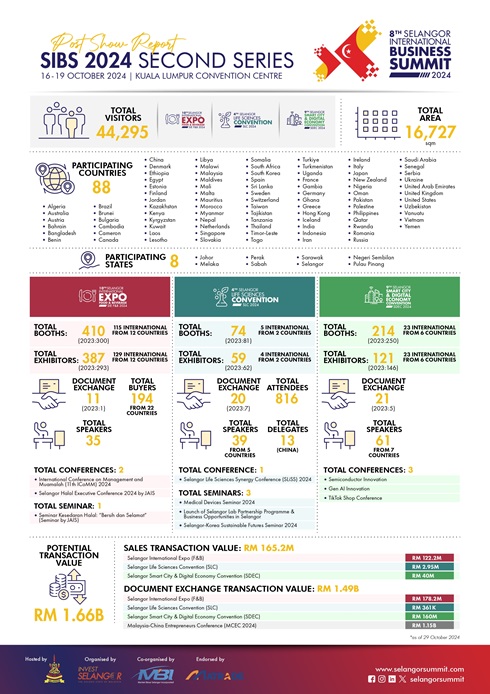 Post-Show Report: SIBS 2024 Second Series InfographicCatalysing ASEAN’s Growth through Innovation, Strategic Alliances, and SustainabilitySHAH ALAM, Nov 6 (Bernama) -- The Selangor International Business Summit (SIBS) 2024 Series 2 wrapped up with impressive results, drawing 44,295 visitors from over 80 countries and generating RM 1.66 billion in potential transactions. Hosted by the State Government of Selangor and organised by Invest Selangor Berhad, the Second Series further solidified SIBS as an international event for business, innovation, and sustainable growth in the ASEAN region, while positioning Selangor as the gateway to the region.